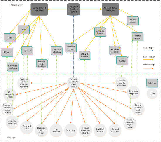 The pattern layer is the model structure of the knowledge graph, which describes the conceptual model of various entities, attributes, and relationships within the domain. Based on 411 reports of marine ship pollution accidents, the ontological types were extracted and designed.