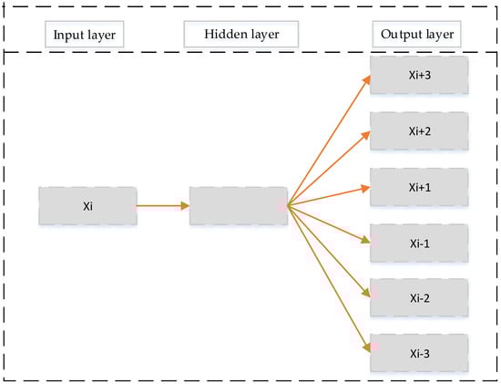 The skip-gram model diagram is shown in Figure 4. The skip-gram model maps each word to a low-dimensional real vector space by learning word embedding vectors. These vectors capture the semantic similarity between words, making words with similar semantics closer in the vector space, so that words can be semantically compared and operated in the vector space. For example, set the input of the skip-gram model to set a sliding window of size three, and the output is the word vector of the context of , which are . The specific calculation formula is as follows: