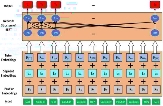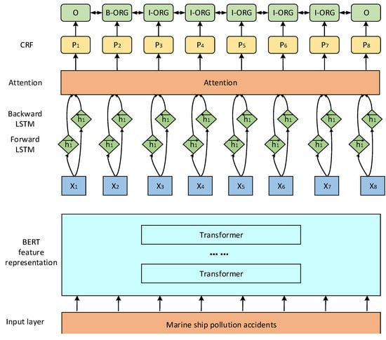 In the initial stage, the accident text is first converted into word vectors through the BERT pre-trained model. Among them, the [CLS] tag is used to represent the whole sentence classification, and the [SEP] tag is used to distinguish two independent sentences. Among them, are the input word vectors of the model, and after passing through multiple encoding converters , the output is word vector sequences. The role of the self-attention mechanism is to obtain features from different aspects. It contains three important quantities, namely, Query, Key, and Value. The principle is to find the most essential information for the query variable from a large amount of information, Key through a query variable, Query, and apply it to Value to suppress other useless information. At the same time, we aim to avoid potential biases or limitations when using the BERT model for entity extraction. We have made specific adjustments to the BERT model to improve its performance in ship pollution accidents. In addition, it also combines the BiLSTM–CRF model to enhance the accuracy and robustness of entity extraction.
