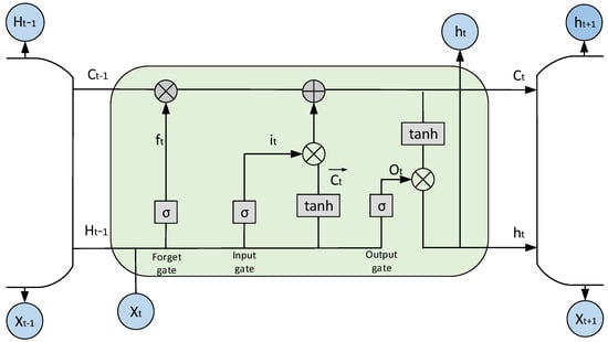 LSTM can obtain longer information and can also achieve two-way semantic capture to obtain more comprehensive semantic information. The input and output of the LSTM are controlled by three gates, namely, the forget gate, input gate, and output gate. Its unit structure is shown in Figure 8.