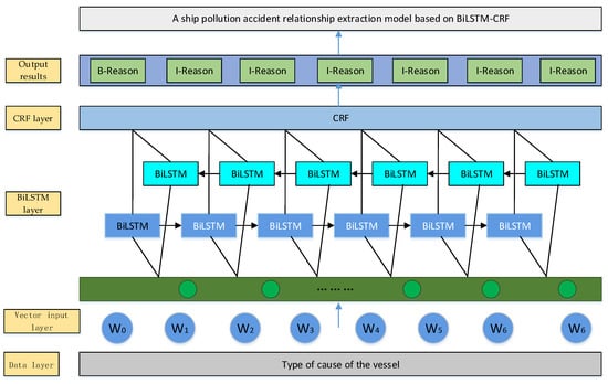The BiLSTM–CRF relationship extraction model combines the advantages of sequence modeling and label dependency modeling, achieving good performance in relationship extraction tasks. Therefore, this paper adopts the BiLSTM–CRF model for extracting ship pollution accident events. The BiLSTM consists of forward and backward LSTM networks, effectively addressing the issue of one-way information propagation in traditional LSTM models. Combining CRF on top of the BiLSTM model can add constraints to the final label predictions to ensure their reasonableness and improve the accuracy of the prediction results. The BiLSTM–CRF model is divided into four layers: the data layer, the vector representation layer, the BiLSTM layer, and the CRF layer. The specific model structure is shown in Figure 9.
