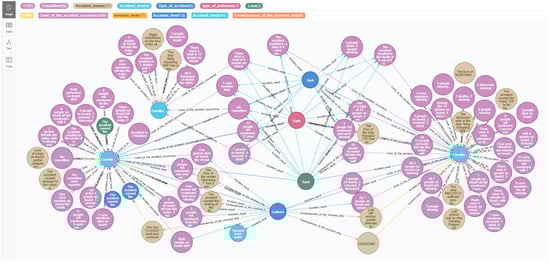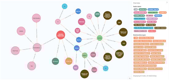 A knowledge graph of marine ship pollution incidents was successfully constructed and stored in the Neo4j graph database, as shown in Figure 11. This graph contains 3928 valid entities and 5793 valid relationships. Nodes in the graph represent entities, and edges represent relationships between these entities. Storing the information in a graph database enables quick querying and localization of information. Through visualization, this graph can present information about the incidents, including the type of incident, causes, involved ship information, consequences, and pollution situations. By converting this information into node labels, key elements can be effectively integrated, reducing the reading burden and providing assistance for information retrieval and investigation.