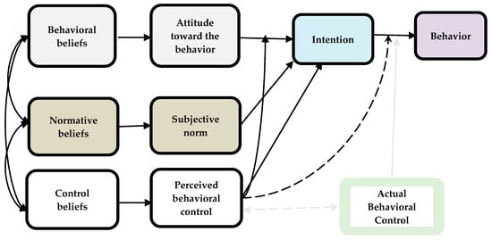 From the TPB perspective, individual intention mainly depends on three determinants: “attitude; subjective norms, and perceived behavioral control” [12] (p. 2). In this context, volitional control can be predicted from “the individual’s intentions to perform a certain behavior” [12] (p. 1). These determinants are based on behavioral, normative, and control beliefs. Thus, individual behavior is described as a function of intention and perceived behavioral control [12] (p. 2).