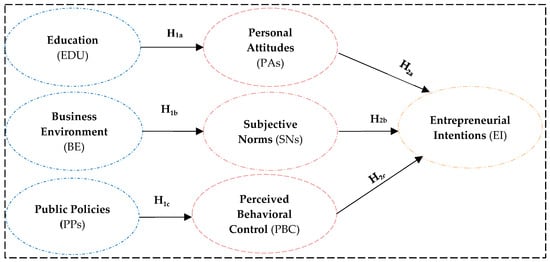 For Kobylińska [9] (p. 99), “government policy has the function of supporting entrepreneurs through various facilities, such as reducing taxes and bureaucracy with a positive impact on commercial activities”. This support and promotion of entrepreneurial activities will influence an entrepreneur’s perception of behavioral control as they will feel more confident if they know that the state can support them through various programs, subsidies, or a stable economic situation. According to this logic, Choudhury and Mandal [21] investigated the roles of subjective norms, education, public policies, and the business environment in the entrepreneurial intentions of university students. The results show that regulations, norms, and government incentives are decisive in the entrepreneurial intentions of the investigated graduates. Thus, the following hypothesis was formulated: