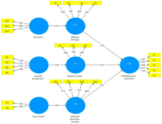 Figure 2 shows the general characteristics of the model aimed at predecessors of the intentions to undertake entrepreneurship in the student context. Three cognitive variables of BPD, which are closely related to entrepreneurship, were considered: personal attitudes (PAs), subjective norms (NEs), and perceived behavioral control (PBC). According to the base model [9] (p. 97), extrinsic (environmental) variables that make up the entrepreneurship support ecosystem were considered, such as education (EDU), the business environment (BE), and public policies (PPs), as they are crucial elements in the composition of the intrinsic (individual) characteristics of an entrepreneur, indirectly affecting the intentions to undertake entrepreneurship (EI).