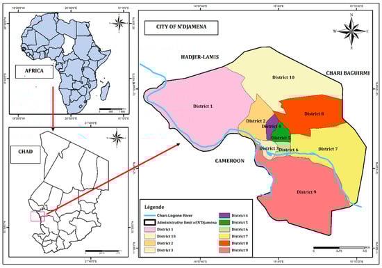 The city of N’Djaména, which forms the spatial framework of this study, is located between 12°00′ and 13°00′ north latitude and 15°00′ and 16°00′ east longitude. The town is bordered to the north by the Hadjer-Lamis region, to the southeast by the Logone river, to the east by the Chari-Baguirmi region, and to the west by Cameroon (Figure 1). N’Djaména has a dry tropical Sahelian climate characterized by two distinct seasons: a long dry season of 7 to 8 months from November to May, and a short rainy season of 3 to 5 months from May to October [38]. Maximum temperatures range from 33.7 °C to 37.6 °C, and the minimum from 20.9 °C to 22.7 °C. Rainfall, in the form of showers, ranges from 400 to 700 mm/year. The city has 10 arrondissements [39] with an estimated population of 1,699,208 in 2020 [40].