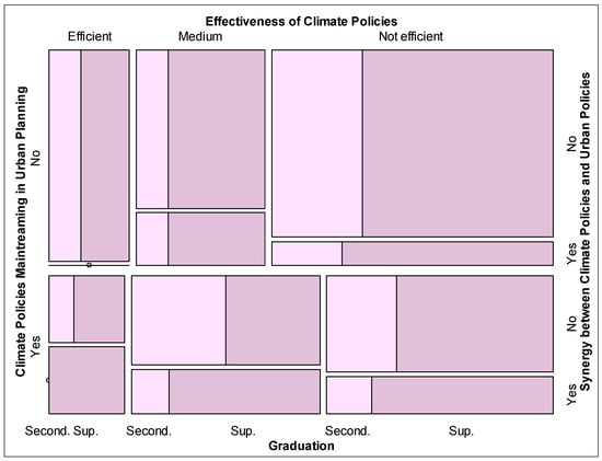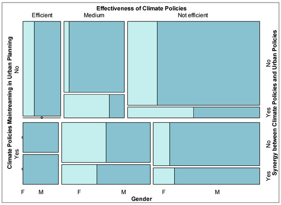The figure below highlights the correlations between the perceived integration of climate policies, their synergy with urban planning policies, and their effectiveness, according to the gender of key informants. The size of the tile is proportional to the percentage of respondents in that level combination. Color variation is gender-dependent (Figure 3). From this figure, the opinion of key informants is that climate policies are ineffective (53% of respondents). This observation was made by both women (12%) and men (41%). This statement is mainly made by respondents who feel that there is neither integration of climate change into urban planning policies nor synergy between climate policies and urban planning (31%). Similarly, 13% of respondents feel that there is integration but no synergy between climate policies and urban planning.