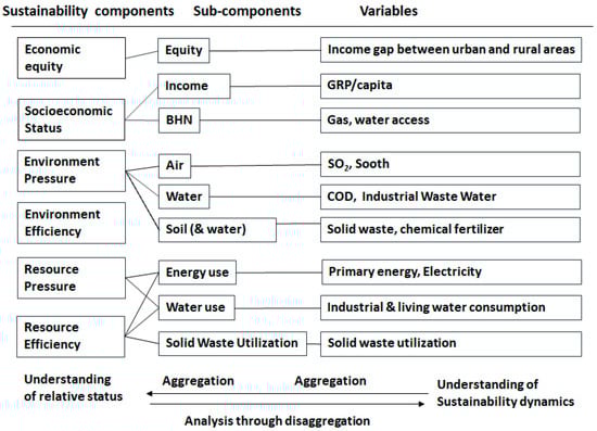 In the assessment system, 15 variables constitute the 9 sub-components and the 6 sustainability components, taken from the official statistical yearbooks from 2000 to 2020 [32,33]. The principal criteria of the variable selection were: (1) data are available spatially and chronologically; (2) variables are specific, measurable, and credible; and variables are meaningful for policy decision-making objectives [17,34]. The socio-economic component contains three sub-components composed of four variables: income, income gap between urban and rural areas within the region, and access to safe water and gas. Although these variables are associated with one another, we included them considering that each has different functions that affect people’s quality of life and, thus, sustainability in different ways. The environmental pressure and efficiency components consist of variables, including sulfur dioxide emissions, industrial gas emissions, solid waste generation, COD discharge, industrial wastewater discharge, and the use of chemical fertilizer. Each of these variables represents the essential aspects of the environment: water, air, and soil.