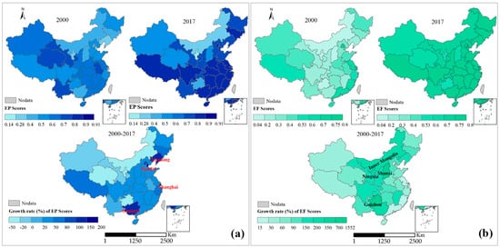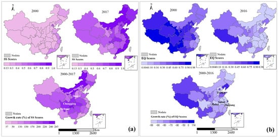Figure 2 shows that the socioeconomic development status of most Chinese provinces has significantly improved between 2000 and 2017. The central region of China has witnessed the fastest improvement in socioeconomic status, with the annual growth rates of SS in Chongqing, Sichuan, Shaanxi, and Inner Mongolia reaching 7.4–8.2%. The eastern and coastal regions have maintained a relatively higher socio-economic status due to their accumulated good foundation of GDP and infrastructure development, with an average growth rate for SS of less than 5% per annum. Economic equity has been dramatically improved in Tianjin, Hubei, and Zhejiang Provinces, with their SQ score reducing at an annual rate of over 22%. However, the income gap showed less improvement in western regions of China, such as the Tibet, Xinjiang, and Gansu Provinces, and even enlarged in Shanghai.
