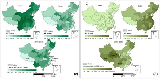 Spatial patterns of China’s environmental sustainability. (a) Environment pressure (EP); (b) Environment efficiency (EE); (c) Resource pressure (RP); (d) Resource efficiency (RE).