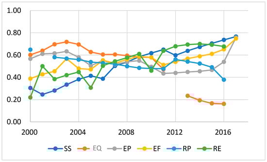 Chronological patterns of sustainability components. Note: SS = socioeconomic status, EQ = economic equality, EP = environmental pressure, EF environmental efficiency, RP = resource pressure, and RE = resource efficiency.