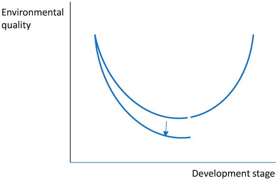 Figure 5 depicts a hypothetical scatter diagram representing the environmental Kuznets curve. The regression results for data from 31 provinces demonstrated an inverted U-shaped relationship between economic growth and environmental pressure (see Table 5). Similar to other provinces, Hebei initially experienced environmental degradation, which began to improve at a certain point. Additionally, the regression results suggest that the curve shifted downward due to the influx of polluting industries from outside the province.