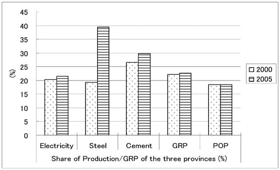 Figure 6 shows the share of the industrial output of the electricity, steel, and cement sectors, GRP, and the population of Hebei, Shandong, and Zhejiang provinces (national output is the total). Although these provinces account for 20% of the GDP and 18% of the population in China, their steel and cement production shares grew during the period. These provinces produced 40% of the national steel output and 30% of the national cement in 2005. The steel and cement industries are energy-intensive and, thus, are the primary source of air pollutants, including SOx, NOx, and CO2 (although this is not included in our assessment). This fact explains the degradation of air quality in these regions. In addition, there are substantial flows of steel and cement products from these provinces to the other regions [34]. The regional input–output table of China in 2000 implies the development of the dependency of steel and cement products in the Beijing/Tianjin region on these provinces. Following the flow patterns between regions would reveal the change in the economic dependency of a region on the others. For this, the latest input–output table is to be constructed. In the highly developed regions in China, the main economic sectors are shifting from the secondary to the service sectors, while the demand for steel and cement products remains strong. Thus, these provinces are becoming centers of dirty industries.