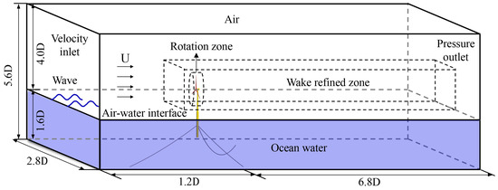 The entire computational domain is 8 D long, 2.8 D wide, and 5.6 D high, where m is the diameter of the wind turbine rotor (Figure 2). Along the elevation direction, the calculation domain is mainly divided into two regions: the air field region and the ocean water region. In addition, the air flow field region is further subdivided into the rotation zone, wake-refined area, and other remaining zones.
