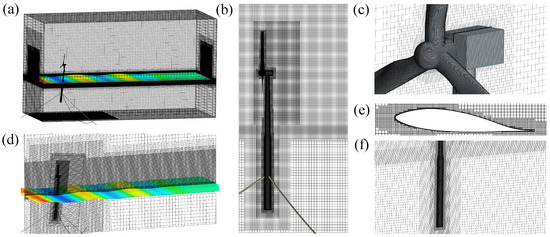 Grid topology. (a) computational domain grid; (b) overset grid around FOWT; (c) runner grid; (d) side view of the grid in the entire computation domain; (e) boundary layer grid positioned on the blade; (f) spar grid.