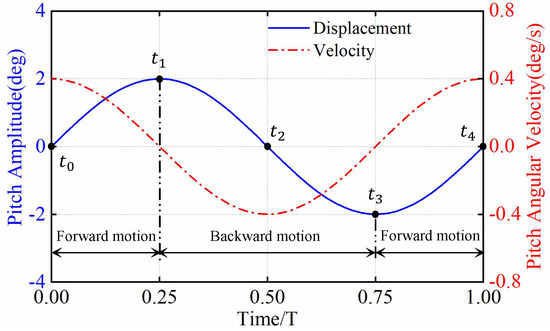 In this study, the aerodynamic performance and wake characteristics of floating wind turbines were considered; therefore, verifying the motion response of the floating platform under wind–wave coupling is essential. The independence of the grid has been verified [40]. Here, it will be further explored. The dynamic response of the floating platform was captured. The platform pitch displacement and velocity at various times are shown in Figure 4.