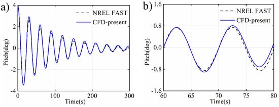 As discussed above, the hydrodynamic damping characteristics of the floating platform were verified using a free attenuation motion simulation. The computing object is only the floating platform, regardless of incoming wind and waves. After providing a certain initial angle, the floating platform was freely released. The results show that the pitch motion is in good agreement with the calculation results of FAST (Figure 5a). In addition, the motion response of the floating wind turbine under regular wave action was verified. The object was a floating platform with a tower. Let the wave be an Airy’s regular wave with wave height H = 6 m and period T = 10 s. It was found that the simulation data have the same periodic fluctuation and amplitude as the FAST calculation results [52,53], which verifies the feasibility of the wind–wave coupling simulation method adopted in this study (Figure 5b).