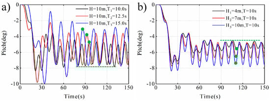 Pitch response of floating platform (a) under different wave periods, = 10.0 s, = 12.5 s, = 15.0 s, and same wave height H = 10 m; (b) under different wave heights, = 4 m, = 7 m, = 10 m, and same wave period T = 10 s.