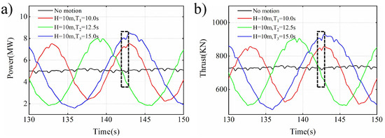 The changes in wind turbine power and thrust over time under different wave periods are shown in Figure 7. Compared to those under non-pitching motion, the power and thrust increase and decrease regularly, which is the same as the pitching response of the floating platform. At the same time, due to the tower shadow effect, the power and thrust of the FOWT exhibit a periodic fluctuation of 0.33 HZ, which is consistent with the frequency of a single blade passing through the tower, as shown by the rectangular dotted box in Figure 7. The average power output of the wind turbine is 4.88 MW, 4.75 MW, and 4.89 MW at 10 s, 12.5 s, and 15 s wave cycles, respectively, while the average power output is 5.10 MW without pitching motion (Figure 7a). The results show that pitch motion significantly reduces the average power output, with a maximum reduction of 6.8%. As the floating wind turbine tilts at a certain angle along the incoming flow direction under the action of wind–wave coupling, the windward area of the wind turbine is reduced. In addition, it was found that with an increase in the wave period, the output work first decreased and then increased, showing an irregular change. This is because the main factors affecting the power output of floating wind turbines are the relative speed and tilt angle. The wave period is short, the frequency is high, and the relative speed between the blade and incoming flow increases, resulting in an increase in the power output. However, this also leads to an increase in the tilt angle of the FOWT and a decrease in the windward area, which in turn reduces the power of the wind turbine. Therefore, whether the power output increases depends on which of the two factors dominates or not. Under wind and wave coupling, the average thrust of the FOWT under pitching motion is smaller than that without motion, see Figure 7b.