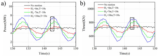 Power and thrust performance of floating offshore wind turbine under different wave heights, = 4 m, = 7 m, = 10 m, and same wave period T = 10 s. (a) power; (b) thrust.