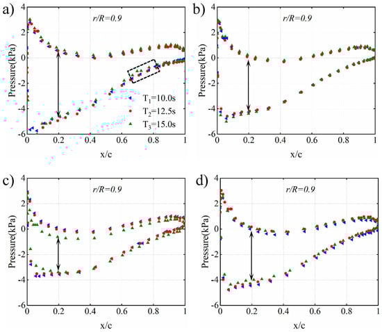 Pressure distribution at a selected blade section under different wave periods = 10.0 s, = 12.5 s, and = 15.0 s during the entire period of the pitch motion. (a) T, (b) T, (c) T, and (d) T.