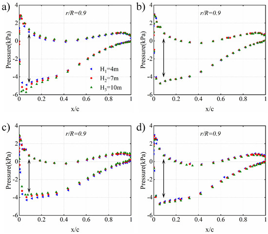 Pressure distribution at a selected blade section under different wave heights = 4 m, = 7 m, and = 10 m during the entire period of the pitch motion. (a) T, (b) T, (c) T, and (d) T.