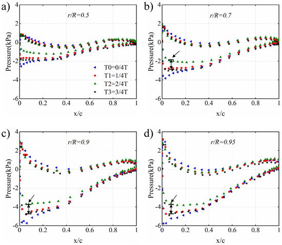 To study the influence of the wind–wave coupling motion on blade aerodynamics in more detail, the pressure distribution of different sections of the same blade in the entire pitch period under the condition of wave height H = 10 m and wave period T = 10 s is given, as shown in Figure 11. The pressure difference between the pressure surface and suction surface in the section near the tip was larger than that in the middle section of the blade. In the pitch period [2/4 T, 3/4 T], the difference is particularly obvious, as indicated by the arrows in Figure 11b–d, because the additional speed caused by the pitch motion varies linearly along the blade span.