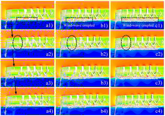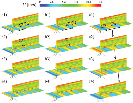 Figure 12a2 shows short wavelengths ( s), followed by Figure 12b2. Figure 12c2 shows long wavelengths ( s), where T. In the case of the shorter wavelength in Figure 12a2, multiple peaks and troughs can be observed. Most of the high-speed regions shown are distributed on both sides of the wave crest. Crests and troughs act as moving obstacles to incoming airflow, causing high and low speeds in these areas. Note that the high-speed region near the wave position is significantly greater than the fluid velocity above the floating wind turbine hub, as shown in the ovals in Figure 12a2,b2. The wave periodic velocity profiles are shown in Figure 12c1–c4. As the wave moves, the wake deficit continues to be affected by pumping characteristics. When the crest is near the turbine, it displaces the water flow upward, causing the speed near the crest to increase and the strength of the wake to decrease. This speed follows that of the wave as it moves downstream. However, it has also been observed that the downstream wake shape is dynamically modulated by waves, and this pumping behavior leads to faster wake recovery.