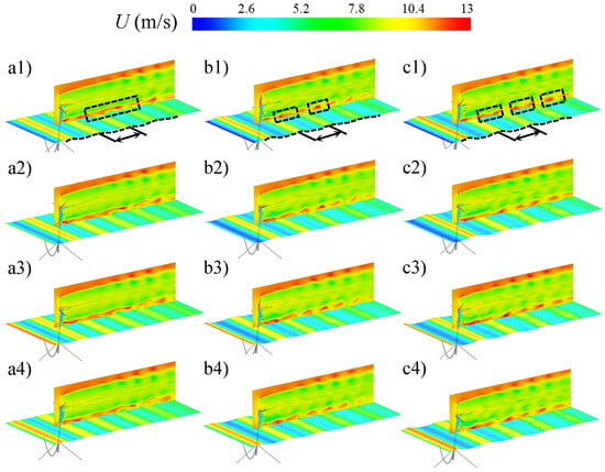 The wave and wake velocities at different instantaneous times and different wave periods for 11.4 m/s inflow. (a1–c1): wave periods s, s, and s at T; (a2–c2): , , and at T; (a3–c3): , , and at T; (a4–c4): , , and at T, wave height m.