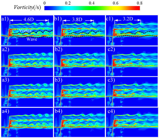 The wake vorticity at different instantaneous times and different wave periods for 11.4 m/s inflow. (a1–c1): wave periods s, s, and s at T; (a2–c2): , , and at T; (a3–c3): , , and at T; (a4–c4): , , and at T, wave height m.