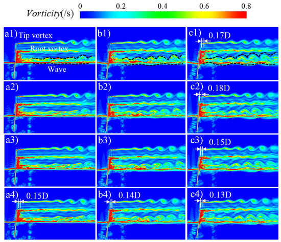 The wake vorticity at different instantaneous times and different wave heights for 11.4 m/s inflow. (a1–c1): m, m, and m at T; (a2–c2): , , and at T; (a3–c3): , , and at T; (a4–c4): , , and at T, wave period s.
