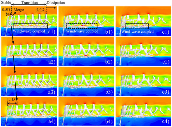 To study the evolution characteristics of the wake vortex zone of the floating wind turbine, the streamwise wake velocity contour with the isosurface of Q-criterion (Q = 0.01) showing hub and tip vortices at different instantaneous times and different wave periods is given. This is illustrated in Figure 16. The wake of a wind turbine is mainly composed of three intertwined root vortices and three spirally developing tip vortices. Figure 16a1 shows that the wake zone of the FOWT can be divided into three zones: the near-wake stable zone (0–0.5 D), middle transition zone (0.5D–4.6 D), and far-wake dissipation zone (after 4.6 D). The near-wake zone (0–0.5 D) was dominated by stable tip and root vortices. The tip vortex had a smooth cylindrical structure. At x = 0.5 D, due to the pitch motion caused by waves, the strong interaction between the blade and the wake reduces the distance between the vortices and causes the smooth cylindrical tip vortices to merge with each other. In the intermediate transition zone (0.5 D–4.6 D), the enhanced secondary tip vortex structure moves steadily downstream with the wind. In the far-wake region (after 4.6 D), the tip and hub vortices eventually evolve into unstable vortices and dissipate gradually. By comparing Figure 16a1–c1, it is found that the increase in the wave period shortens the wake length in the near-wake region and the transition region, and accelerates the development of the vortex structure in the far-wake region. In addition, the position where the wake tip vortex structure begins to merge in the pitching process is not invariable and ranges from 0.5 D to 1.1 D in one wave period, as shown in Figure 16a1–a4.