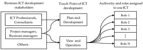 Fundamental systems such as Enterprise Resource Planning (ERP) are designed to standardize and streamline processes []. Generally, business-critical systems clearly segregate the roles and authority of individuals who use the system and fix and restrict their job descriptions. Under these conditions, the diversity of individual knowledge and experience is fixed and limited to the definitions of the roles and positions of authority in the workplace []. Therefore, the company’s ability to draw on the diverse knowledge of individuals and the expansion of employees’ skill sets and career directions [] are not considered. Modern business systems aim to streamline operations, set rules, and clearly classify roles, as shown in Figure 1, so that the system is restricted to a fixed framework rather than one that demonstrates diversity and equity.