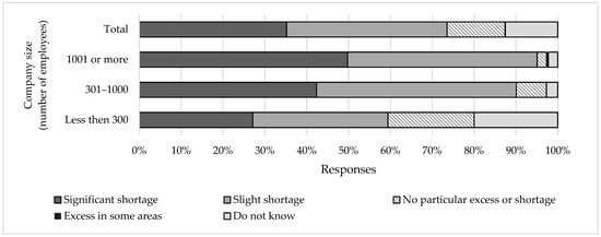 First, we analyzed the results of the survey on the demand for IT personnel in companies. Figure 2 illustrates the responses to this question. For companies with more than 1001 employees, 49.8% of respondents indicated that there is a “significant shortage”, and together with the “slight shortage”, more than 95% of them indicated that there is a shortage. The same results were observed for companies with 301 to 1000 employees, with a total of more than 90% of respondents indicating that they are experiencing a shortage. For smaller companies with less than 300 employees, 59.4% of respondents answered that there was a shortage. These findings indicate that companies are inadequately staffed relative to the demand for IT personnel.