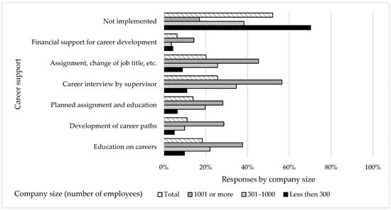 The next step is to examine the situation in ICT education in the workplace. To this end, we review the results of a survey on the education of IT personnel in companies. Figure 3 shows the results of responses to the question, “What kind of career support do you provide to your IT personnel development?”. The survey revealed that 37.7% of large companies (1001 or more employees) and 9.8% of small companies (less than 300 employees) reported that their companies provide training to improve their employees’ IT skills. This indicates that there may be inequity in the allocation of time or budget for training. Moreover, 70% of the companies, particularly among small companies (less than 300 employees), indicated that they had not implemented any measures, in contrast to the companies that indicated that they had taken some measures. It is challenging for SMEs to invest in IT training [].