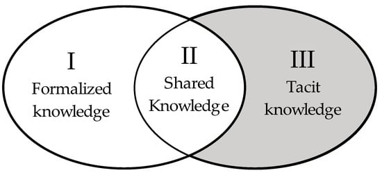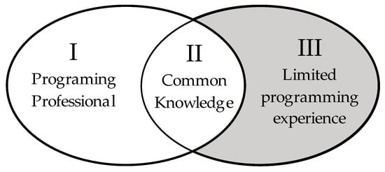 The implementation of low-code platforms has facilitated the progress of programming in meticulous tasks not previously considered for systemization, akin to the tacit knowledge possessed by administrative staff. Therefore, it can be argued that low-code programming fits well with individuals who possess previously unexpressed knowledge and have brought their tasks into the realm of socialization [], thus contributing to the improvement in DEI within the organization. This relationship is illustrated in Figure 4. The left circle in Figure 4 represents the technical scope of programming-skilled individuals, whereas the right circle represents the technical scope of non-programmers. The overlapping areas signify a shared knowledge domain (related to IT and business). Low-code application development fits into area (III) of tasks, in which explicit programming is not feasible owing to unexpressed knowledge.