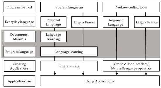 This section examines the characteristics of low-coding-type software production, with particular attention paid to the specifications that are the focus of this study based on the results found throughout this project. Some of the benefits of low-coding for the utilization aspect of the SDGs include the following: according to the 2023 Global Gender Gap Report, science, technology, engineering, and mathematics (STEM) occupations are important and pay well, and they are expected to grow in importance and scope in the future. However, the percentage of women in STEM occupations remains significantly under-represented. In the absence of on-the-job training (OJT) for the purpose of learning a programming language, the development of raw code can be intuitive without language training, thereby enabling individuals to utilize it without discrimination. Another challenge is that technology manuals are often written in the majority language, primarily English. Consequently, individuals who are unable to read English are unable to learn it. Furthermore, in regions where English is not widely spoken, self-study of technology, such as programming, may be impeded. In this instance, low-coding policies can be programmed through the sensory manipulation of a graphic interface (GUI) without the necessity to peruse the text.