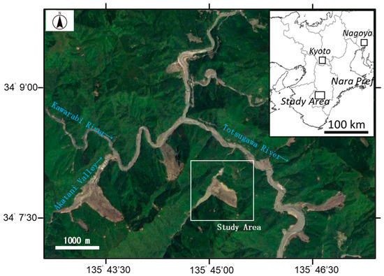 The study area was located in the upper reaches of the Kumano-gawa (kawa or gawa means “river” in Japanese) catchment on the Kii Peninsula in central Japan (Figure 1). The Kii Peninsula comprises 79.9% mountainous areas and 8.6% lowlands. In terms of land use, 78% of the land is forested, 10% agricultural, 1% residential, and 11% public. According to Hiraishi and Chigira [11], more than 60% of the terrain in this area consists of DLs near knickpoints. These knickpoints were formed by the rapid downcutting associated with the uplift of mountainous areas. The lowest section of the analyzed area exhibited additional knickpoints and was considered unstable. The Kii Mountains are predominantly underlain by a Cretaceous to Paleogene–Lower Miocene Shimanto accretionary complex containing minor occurrences of Miocene granites and sedimentary rocks. The complex comprises mudstone, sandstone, acid tuff, chert, and greenstone [26]. The Northern Shimanto accretionary complex comprises the following five formations trending ENE–WSW, arranged in order from north to south: the Hanazono, Yukawa, Miyama, Ryujin, and Nyunokawa Formations. The geology of the upper reaches of the Totsukawa River, where the study site was located, corresponds to the Shimanto accretionary complex of the Miyama Formation [27]. The Miyama Formation consists primarily of Late Cretaceous sandstone and alternating sandstone/mudstone strata along with mixed rocks containing basalt, chert, and tuff masses [28]. Low-angle thrust faults are aligned subparallel to each other with spacings of a few kilometers. A crush zone comprises a large-scale thrust fault in a continuous weak layer that forms a barrier to groundwater flow, leading to a rapid increase in pore pressure during rainstorms, and potentially triggering catastrophic slope failure [29]. The Kii Peninsula is one of the wettest regions in Japan, with an average annual rainfall of 1414 mm/year during 1991–2020. During the same period, the average monthly rainfall from November to April of the following year was 77.4 mm/month, with a distinctly different trend of 158.3 mm/month from May to October. The Kii Peninsula has a mean annual rainfall of 1320 mm/yr (1981–2010), making it one of the wettest regions in Japan. Typhoon Talas released more than 2000 mm of precipitation on the Kii Peninsula [30]. The total rainfall in the vicinity of the study site from September 2 to 5 ranged from 900 to 1200 mm. In terms of the precursor topographic features, Chigira et al. [10] reported that all landslides had small scarps near their future crowns before the slide, and one landslide had linear depressions along its future crown. In [22], topographic features were investigated using pre- and post-slide slope maps. Irregular undulations were found in the pre-sliding areas, indicating incomplete separation of the displaced rocks from the sliding surface.