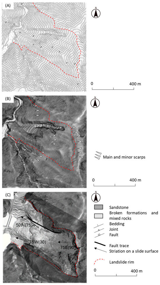 (A) Contour map obtained before landslide. (B) Image of the slope before landslide: darker shade indicates steeper slope. (C) Geological map plotted on an image of the slope after the landslide.