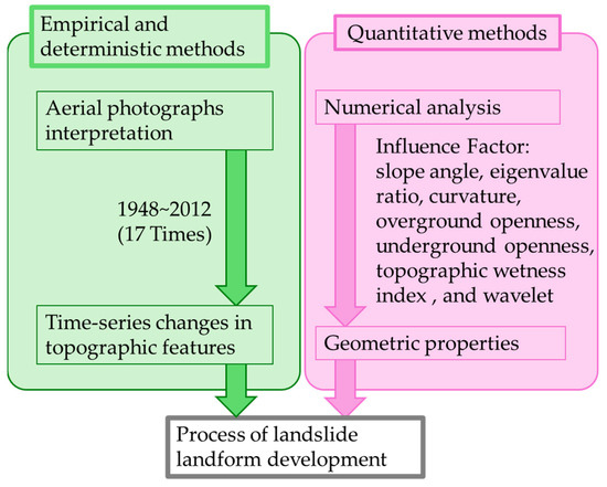 The workflow of this study is shown in Figure 3. Both empirical and deterministic methods were used. First, an empirical qualitative method was used, focusing on the comparative of time-series aerial photograph interpretations to determine the contour of the moving body (referred to as the area of change) and the source of collapse based on the changes in topography, vegetation, and geological features before and after the occurrence of a deep-seated collapse.