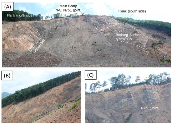 Photograph of deep-seated landslide (DL). (A) Overall view of collapsed area showing the main scarp bracketing the central area of the landslide mass. The north flank comprises alternating strata dominated by sandstone, whereas the south flank comprises alternating strata dominated by shale. The two flanks show a prominent fault surface and bedding plane, respectively. (B) The side view of the north flank shows discoloration due to weathering deep into the profile, indicating advanced degradation within the landslide mass. (C) Crown and main scarp. The main scarp has an N-S strike and shows prominent high-angle oblique joint surfaces with an N75E strike.