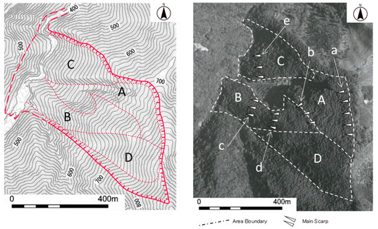 Delimitation of morphological zones in the study area based on pre-slide aerial photographs. (Left) Contour map created based on data from LiDAR in 2009; (Right) Aerial photograph captured in 2004 (No. 10 in Table 2). A, B, C, and D indicate areas divided according to topographical features of the DL area. (a) Main scarp of the continuous crown on the eastern margin; (b) minor scarps at boundary between Zones A and B; (c,d) Minor scarp of convex upslope; (e) arcuate scarp facing the riverside.