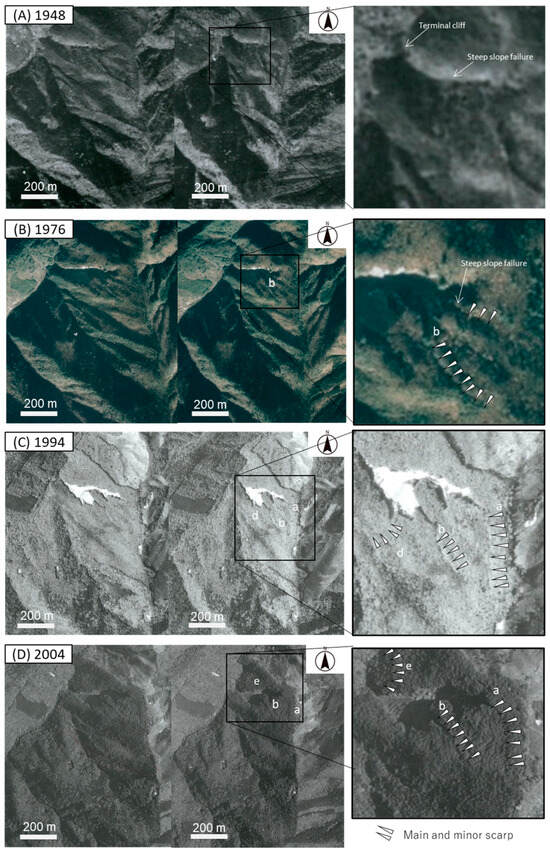 Figure 6 shows stereo aerial photographs from 4 of the 17 time points. Lowercase letters in the figure correspond to those in Figure 5. The steep slope failure in Zone A and the terminal cliff failure in Zone C captured in 1948 are depicted in Figure 6A. These findings indicate the instability of Zones A and C. Figure 6B, captured in 1976, shows a minor scarp (Figure 6B) along the boundary between Zones A and B, indicating the progression of destabilization. Figure 6C, captured in 1994, shows the continuous crown of the main scarp (Figure 6A) near the ridge in Zone A (Figure 5) on the eastern margin, indicating the progress of gravitational deformation. A small arcuate scarp (Figure 6D) was observed at 160 m from the western margin of Zone B (Figure 5), indicating that the effects of gravitational deformation extended to Zones B and A. As shown in Figure 6D, which was captured in 2004, the main scarp near the ridge in Zone A is even more distinct. The minor scarp at the boundary between Zones A and B (Figure 6B) was also more evident than that in 1994, as depicted in Figure 6C, and new knickpoints appeared in Zone C (Figure 5). The geological structure on the southern side of Zone D forms a gentle valley with an NW-SE strike. It is possible that the formation of this valley is associated with the lateral slide in Zone B (Figure 5). Typhoon Talas in 2011 caused further destabilization of the terminal cliffs of Zones B (Figure 5) and C due to the undercutting of Nagatono Valley, which, together with the previous deformation in Zone A, ultimately led to slope failure.