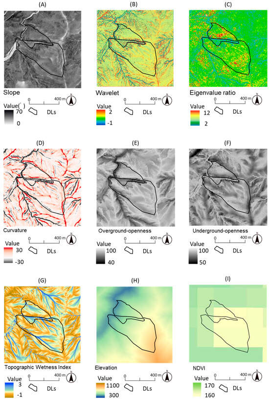 Numerical analysis results. (A) Slope, (B) wavelet, (C) Eigenvalue ratio (EV), (D) curvature, (E) overground openness, (F) underground openness, (G) topographical wetness index (TWI), (H) elevation; (I) NDVI.