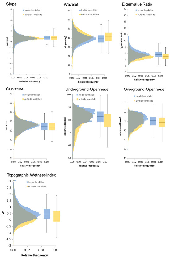 We performed numerical analyses to investigate whether the locations identified as deformities based on the time-series interpretation of the aerial photographs also exhibited statistical characteristics. The numerical analysis results and histograms of various parameters are presented in Figure 7 and Figure 8, respectively. The seven parameters analyzed included slope angle, wavelet, eigenvalue ratio, curvature, overground openness, underground openness, and TWI.