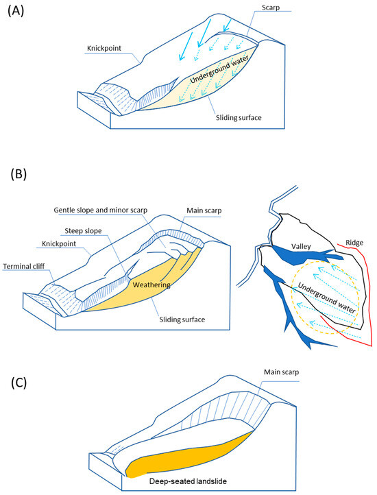 Block diagram showing features inside and outside the landslide. (A) Initial stage of displacement. A sliding surface has developed, but a distinct landslide body is not yet apparent at the surface. (B) Rainwater does not flow over the slope surface, but rather penetrates the ground via fissures and cracks, causing weathering and alteration of the landslide body. Accordingly, marshy terrain does not form on the ground surface. Because the landslide body concentrates more water than the surrounding area, the landslide body undergoes selective degradation. Terminal cliff failure causes the deformation of the degraded landslide body. Minor scarps appear on the landslide body surface. (C) Occurrence of large-scale deep-seated landslide following this progressive destabilization combined with the torrential rains.