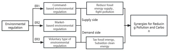 24]. ER is often separated into three categories: command-type, market-based, and voluntary regulation. Command-type ER includes orders, controls, specifications, and other measures and imposes certain mandatory and hard constraints. Market-based ER is implemented by market means following market signals and mechanisms, mainly including measures such as emission taxes, emission permits, and environmental subsidies [