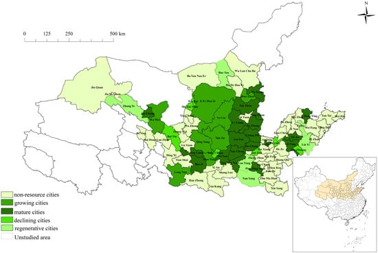 There are significant differences in the development modes between resource-based and non-resource-based cities of the basin. Resource-based cities are mainly dominated by the mining and processing of natural resources such as minerals and forests and generally face the dual pressures of ecological destruction and high carbon emissions in the region [54]. Therefore, based on the National Sustainable Development Plan (NSDP) for Resource-Based Cities issued by the State Council in 2013 [55], this paper further divides the research objects into resource and non-resource, with a total of 40 resource-based cities and 38 non-resource-based cities. In addition, following the principles of classified guidance and distinctive development, the NSDP divides resource-based cities into four types, growing, mature, declining, and regenerative, based on the capacity for resource security and sustainable development. This classification is also reflected in our study (Figure 2).