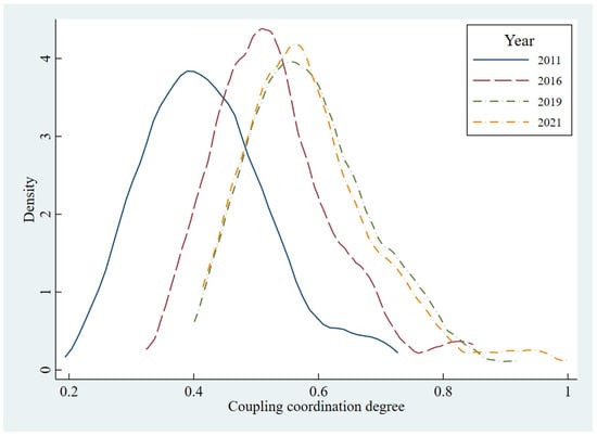 The kernel density curve of DTE system coupled coordination in the Yellow River Basin.