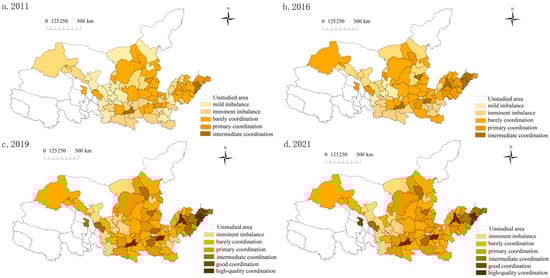 The spatial evolution of DTE system coupling coordination in the Yellow River Basin. (a) Coupling coordination level in 2011; (b) Coupling coordination level in 2016; (c) Coupling coordination level in 2019; (d) Coupling coordination level in 2021.